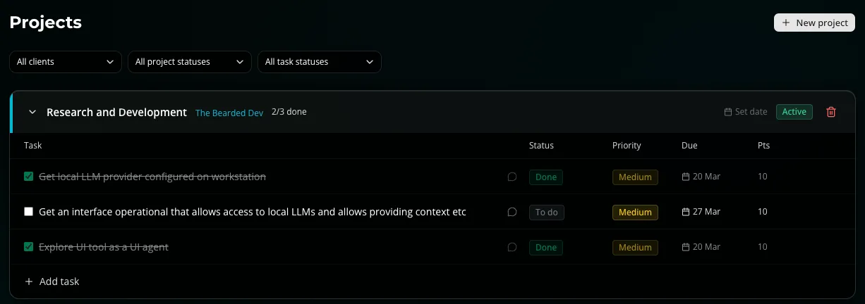 A focused tool for neurodivergent solo contractors. Know what to work on, track your time, and actually feel good about what you get done.